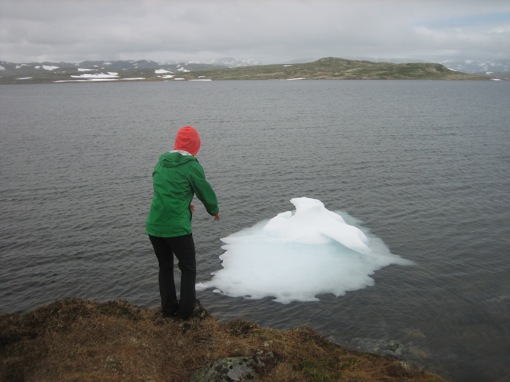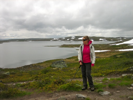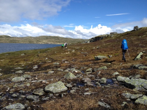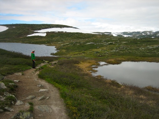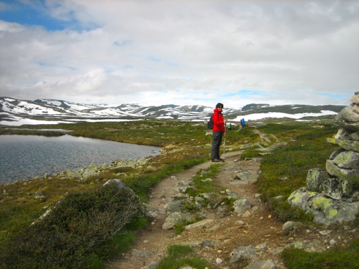 Langs de noordelijke oever van het meer loopt een duidelijk aangegeven en goed begaanbaar pad door het mos van de H’vidda. De wandeling gaat vlot en we komen al snel toe aan het punt waar we tussen het Storekraekkja meer en het Orterenmeer wandelen.