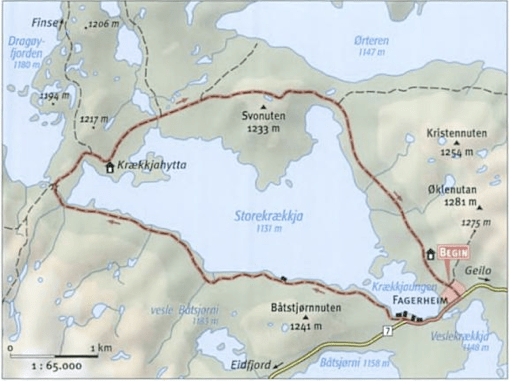 We parkeren de auto aan de Fagerheim hut en starten de wandeling rond het grote Storekraekkja meer.