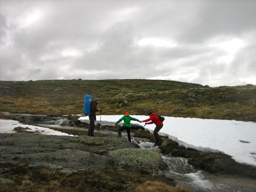 We stappen voorbij het hoogste punt van de Svonuten en naderen, na een gevaarlijk gladde rivier-oversteek, de Kraekkjahytta van DNT. In de hut drinken we een koffie en krijgt Oskar een papje.