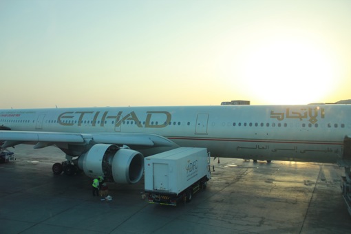 Na een dik uur wachten (we zijn uiteraard weer veel te vroeg vertrokken), stappen we in het vliegtuig: een groot en precies splinternieuw vliegtuig van Etihad. We krijgen een stuk pizza en houden ons bezig met het entertainment systeem. Na een film, enkele keigrappige afleveringen van Miranda, een slapeloze “nacht” en een arabisch ontbijt met kefta, komen we -6 uur later- toe in Abu Dhabi.