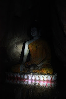 De man volgt ons en wandelt zelfs met ons mee. Hij overtuigt ons om hem te volgen naar een grot en reikt elk een zaklamp aan. We weten niet goed wat zijn bedoeling is, maar besluiten de man toch te volgen in de grot. Binnen in de onverlichte gangen van de grot staat een enorm boeddabeeld.