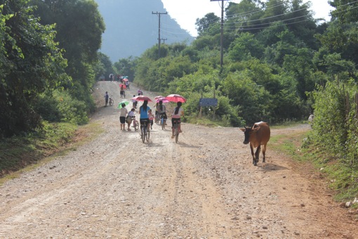 We keren na het grotbezoek terug naar het hotel en eten er een Tom Yum soep en Lao Chicken, met verse milkshakes. We houden een lange middagpauze om te lezen en af te koelen van de hitte. Nadien fietsen we verder om tot een uitzichtspunt op een berg te geraken. De school is ondertussen gedaan en we komen overal weer fietsende kinderen tegen met paraplu’s tegen de zon. Net als gisteren, worden we overal begroet met “sabaideee!”.