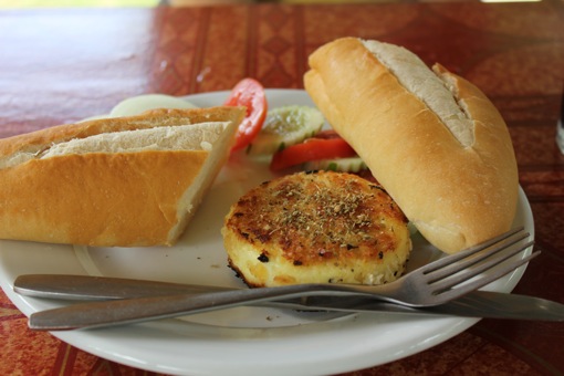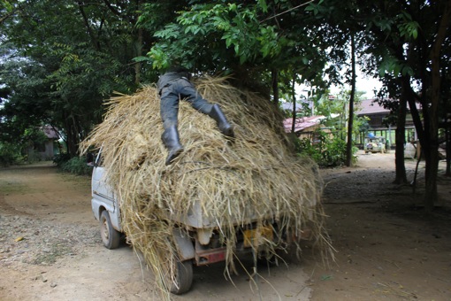 We ontbijten met banana & chocolate pancakes in de Guesthouse, in gezelschap van twee schattige lapjeskatten. Na het ontbijt nemen we de gehuurde fietsen en fietsen we tot de Organic Farm, 4 km ten noorden van Vang Vieng. Het is nog vroeg en toch is het een helse tocht omwille van de verpletterende hitte.