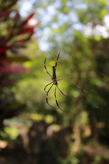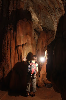 De man maakt muziek door op de stalactieten te kloppen en leidt ons nog verder door de smalle spleten de grot in. Ik krijg het benauwd wanneer ik me langs een rots kronkel en oog in oog kom te staan met de grootste spin die ik ooit heb gezien: ter grootte van mijn handpalm. Ik krijg schrik dat ik een spin zou raken wanneer we ons door de spleten murmen en begin bovendien te vrezen dat de man ons wil doen verdwalen om dan geld te kunnen vragen of stelen of wie weet nog erger…. Ik weiger nog verder te gaan. De oude man wil me overtuigen: “big room, beautiful, not far”, maar ik zet geen voet verder. Ulrike wil de big room zien en besluit verder te gaan met de man, terwijl ik wacht ter hoogte van de megaspin. Ik hoor ze verderweg gaan, tot ik plots helemaal niets meer hoor. In de stilte sla ik in paniek. Wat als hij haar vermoordt? Verkracht? Ik ben doodsbenauwd. Ik roep een paar keer en krijg geen antwoord. Gelukkig hoor ik na een minuut hun stemmen terug dichterbij komen. Oef! Ik maak duidelijk dat ik zo snel mogelijk terug naar buiten wil, maar we moeten van de man eerst nog langs een andere ruimte waar we een vleermuis te zien krijgen.