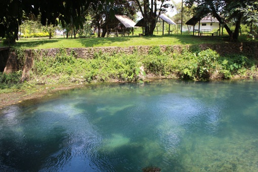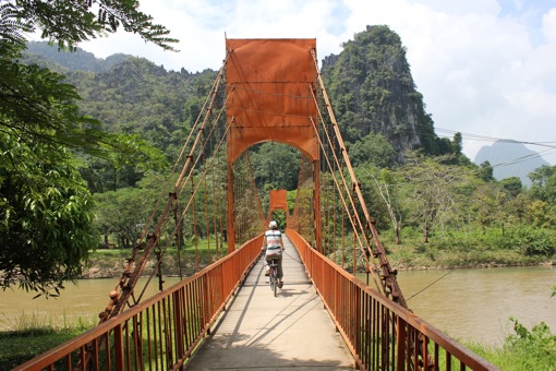 Na een korte opfrissing in de rivier fietsen we terug door de hitte tot het Vang Vieng Resort. Het is tergend heet en we geraken maar moeizaam vooruit. Aan het Vang Vieng Resort betalen we tol om over de brug tot een leuke zwemplek en grot te geraken.