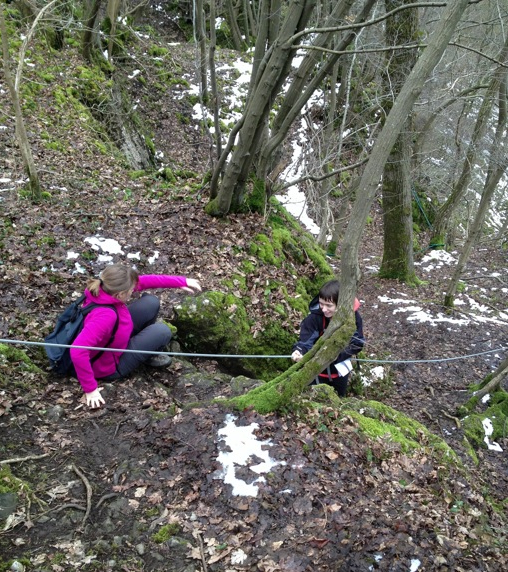 Maar de kabels houden op en de “weg” wordt steeds steiler. Door de smeltende sneeuw liggen de rotsen er gevaarlijk glad bij en we besluiten dan maar rechtsomkeer te maken, terug naar de weg langs de camping.