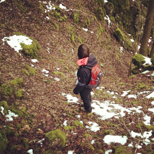 Het paadje wordt steeds onduidelijker en algauw is er geen pad meer te bespeuren. Dan maar dwars naar boven, de richting die we uit moeten. Eenmaal boven op het plateau komen we bij een autoweg terecht en stappen we tot aan het Poilvache kasteel.