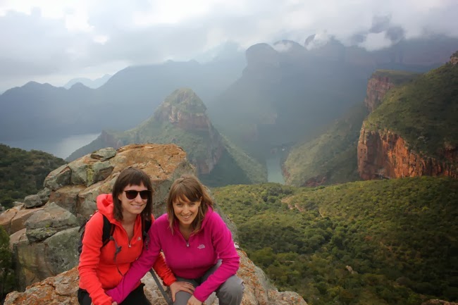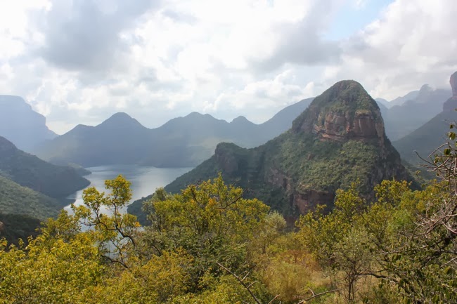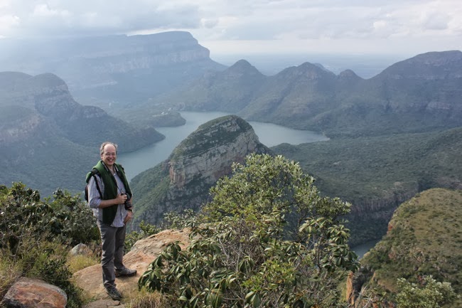Het weer is wat aan de onstabiele kant, maar we trekken er toch vroeg op uit om de Panorama Route te verkennen. We beginnen bij Blyde River Resort, want dit domein geeft toegang tot een prachtig stuk natuur. Aan het office melden we ons aan en splitsen we op. De ouderen kiezen voor de Lourie Trail, een korte en gemakkelijke wandeling, en de jeugd voor de meer uitdagende trek, de Leopard Trail. Beide wandelingen komen uit op hetzelfde pad, de Guinea Fawl Trail. Maar niet vooraleer we samen van het uitzicht gaan genieten. We hebben zicht op een immens grote canyon, met in de verte de Three Rondavels, drie grote ronde rotsformaties die lijken op traditionele hutten en de Horseshoe Bend, waarrond de Blyde rivier zich een weg baant.