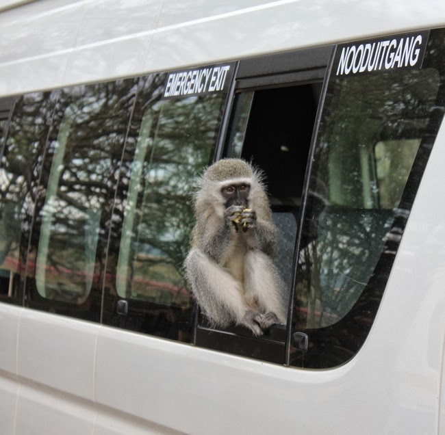 Even later vertrekken we met de minivan naar de volgende bezienswaardigheid op de route: Bourkes Luck Potholes. Deze potholes zijn grote, ronde rotsformaties die gevormd zijn door eeuwenlange erosie. Er is veel volk, vooral locals die op bezoek zijn met school. Behalve auto’s zijn er op de parking ook veel vervet monkeys, die allesbehalve mensenschuw zijn. Eentje kruipt zelfs in de bus naast ons en steelt daar een appel.