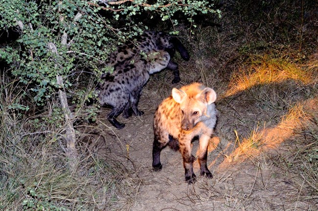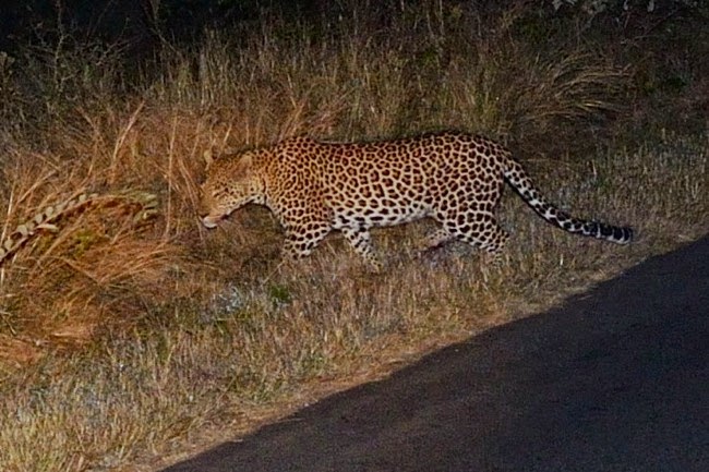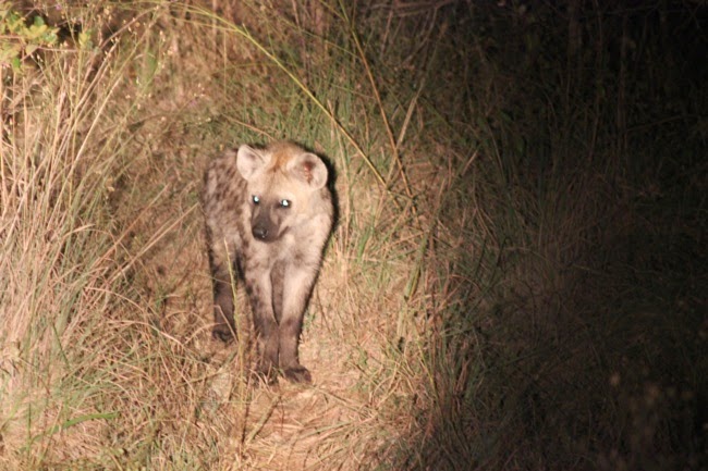 We zien oogjes blinken in de verte, maar pas tegen het einde toe wordt het echt interessant. We zien vier jonge hyena’s aan de rand van de weg die ons even geïnteresseerd aankijken als wij hen. Plots daagt het toch dat we op slechts anderhalve meter van deze dieren staan in een open wagen – terwijl we overdag zelfs geen venster mogen open zetten. We zien ook een koppel stekelvarkens en een witstaartmangoeste. Die laatste wordt opgejaagd door het meest onvoorstelbare roofdier dat we zien: het jachtluipaard.