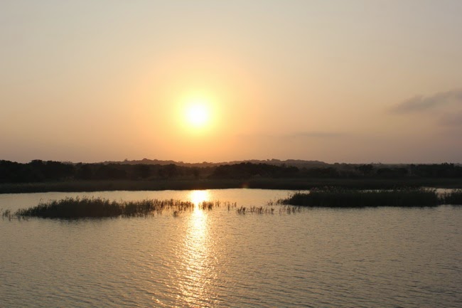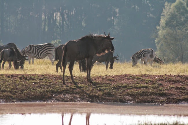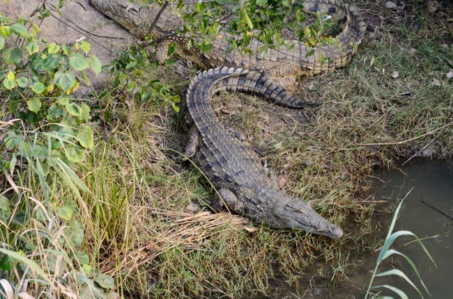 Vanuit het bos hebben we plots terug uitzicht op de plas met bijhorende krokodillen. Ook al is het al warm, we blijven uit de buurt van het water! Langs het water loopt de baan en daarlangs is een weide met enkele kuddes zebra’s, impala’s en kudu’s.