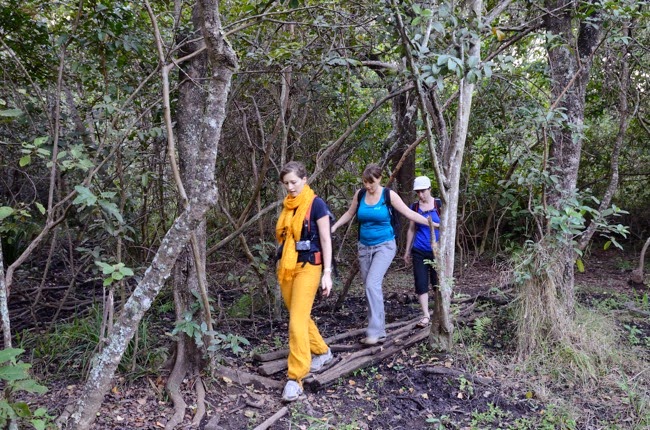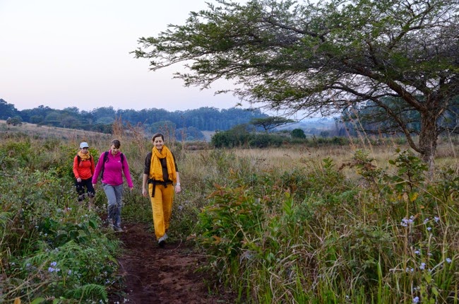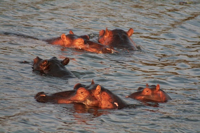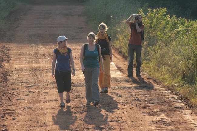 De voorbije nacht hebben we een luid gestommel en gestamp gehoord, we vermoeden dat er een bende hippo’s voorbij onze hut getrokken zijn, blijkbaar gebeurt dat hier wel vaker. We willen vandaag absoluut nog een wandeling in het park maken, dus staan we om 6h op en trekken we er op uit met z’n vieren, zeg maar “de jeugd”. De zon is nog niet eens opgekomen wanneer we de hutten achter ons laten.