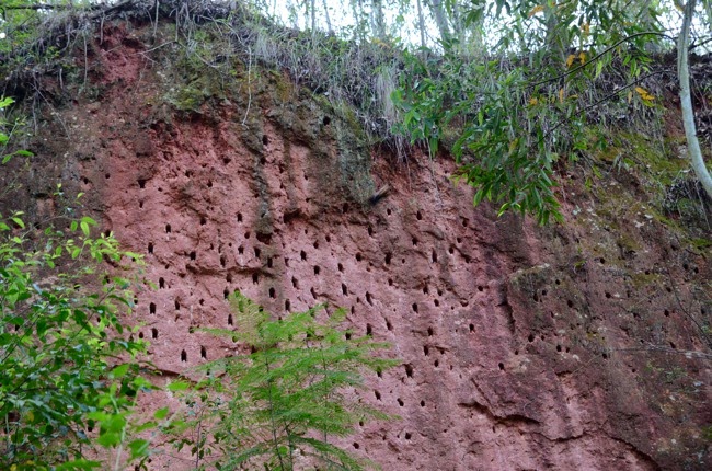 We verlaten de open vlaktes en wandelen door een bos en een soort canyon. Plots schrikken we op en zien we honderden vogeltjes uit de rotsen komen. Blijkbaar hebben ze in de rots hun nestjes uitgegraven, de ingang van de gaatjes zijn net groot genoeg voor hun lijfje en twee pootjes.