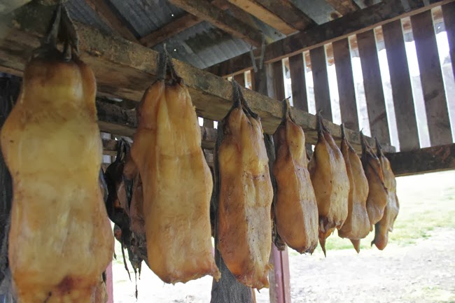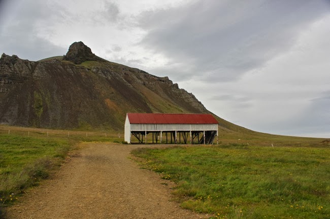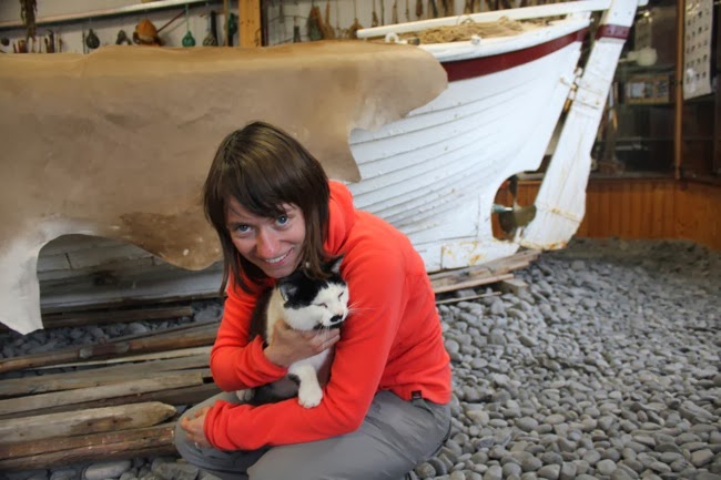 De stranden laten we nu even voor wat het is en we vervolgen onze weg via route 54. Aan het kleine museum van Bjarnarhofn houden we halt. De boerderij is gespecialiseerd in de productie van gefermenteerde haai, Hakarl. De lieve eigenaars geven ons met veel passie uitleg over het rottingsproces dat nodig is om een stuk haai om te vormen tot de gekende delicatesse. We proeven er een stukje van de rotte haai: eerst zijn we overweldigd door de scherpe geur van ammoniak, maar wanneer de haai wegknabbelen met een stukje peperkoek valt de smaak nog wel mee. Ulrike neemt zelfs een tweede stukje, ik hou het liever bij één stuk. Het museum is een verzameling van allerlei oude visserspulletjes en opgezette dieren. Er loopt een superlieve kat rond, die ons doet denken aan onze poes in België.