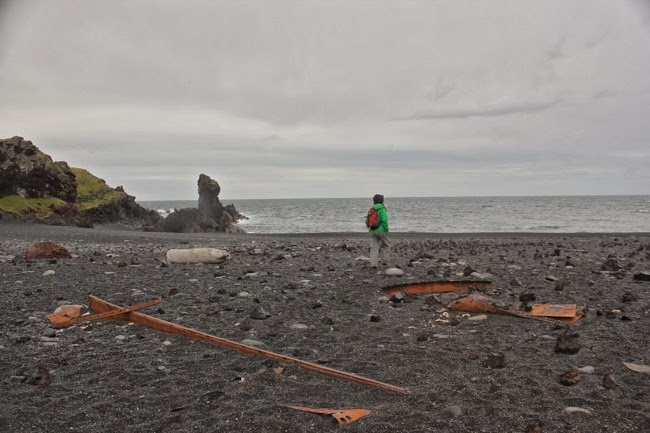 Ondanks de koude avond van gisteren, hebben we het lekker warm gehad vannacht. We slagen er in om net voor het begint te regenen onze tent op te plooien en rijden naar de dramatische kliffen van Djupalon en Dritvik. Het strand is er bezaaid met resten van een aangespoeld scheepsvrak: de roestige stalen brokstukken vormen een mooi contrast met het zwarte zand. We proberen er de vier zware stenen te heffen die vroeger werden gebruikt om te testen of je geschikt was om visser te worden. De lichtste steen weegt 23 kg, de zwaarste 154 kg!