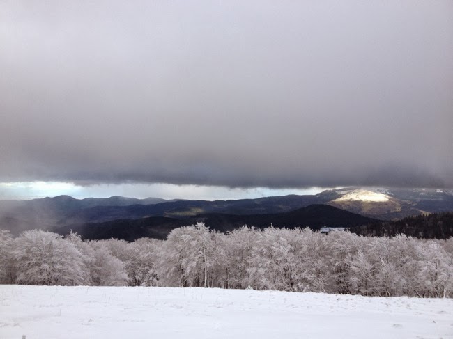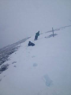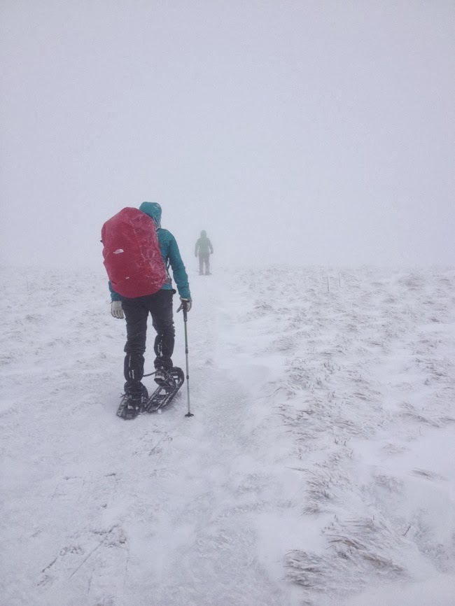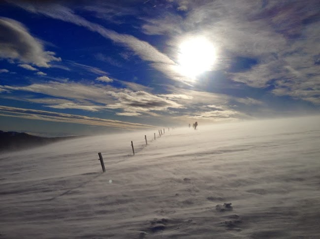 Met z’n vieren nemen we dezelfde route als gisteren, over de Hohneck. Vandaag gaat dat nog moeilijker want we zijn omgeven door een dikke mist en zien met moeite het volgende paaltje. Op het pad langs de zuidflank van de Hohneck worden we ook nog blootgesteld aan hevige rukwinden waardoor we soms even moeten stoppen om het evenwicht te bewaren. We zijn de eersten op het pad en zakken flink door de sneeuw. Soms zakken we zo diep dat we zelfs omvallen, wat voor het nodige geschater zorgt! Gelukkig hebben we een goed kompas en kaart en kunnen we zonder al te veel zoekwerk tot aan de Col du Schaerferthal navigeren.