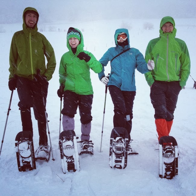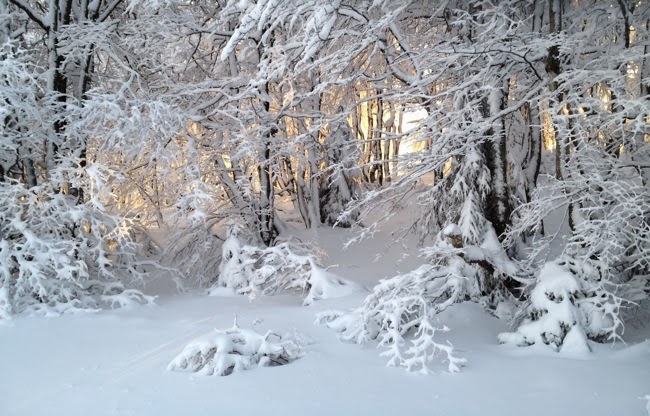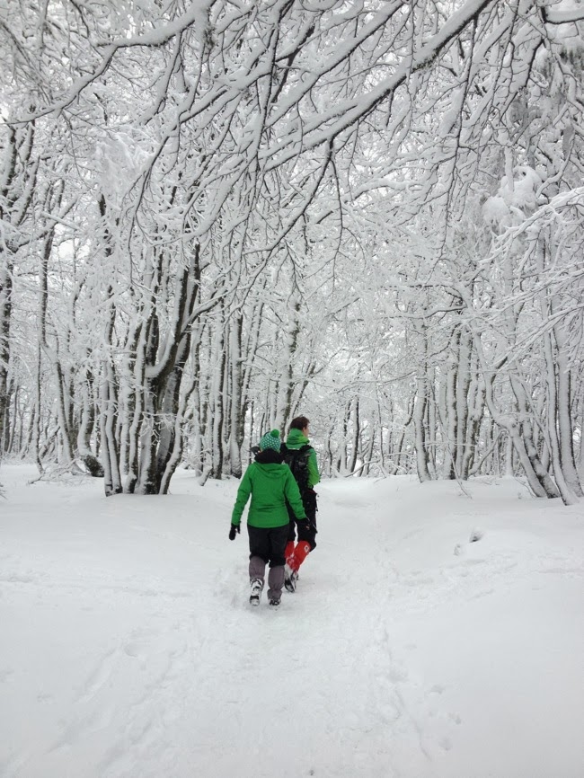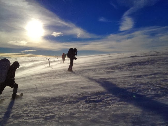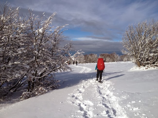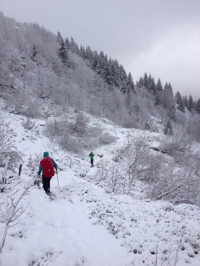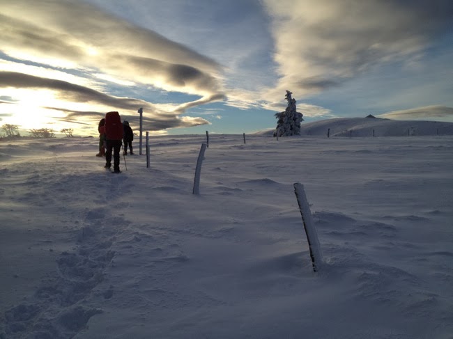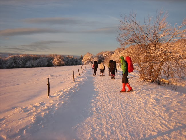 We worden enthousiast wakker gemaakt door Uli met de aankondiging dat er geen wolkje te bespeuren valt. We ontbijten in de refuge en maken ons klaar om te vertrekken. Het is 8u30 wanneer we helemaal ingeduffeld, met de sneeuwschoenen aan, de koude buitenlucht trotseren. We worden meteen getrakteerd op een prachtige zonsopgang met bijhorende rode gloed op de besneeuwde bomen. Prachtig!
