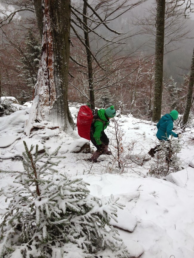Na een lange afdaling door het bos, komen we rond 14u30 toe bij de abri. Binnen de hut is een familie aan het lunchen, ze hebben het open vuur aangestroken: handig! We stellen de tenten op en warmen ons op in de hut. De familie vertrekt weer en we nemen de zorgen voor het vuur over. De mannen halen wat hout in de omgeving, helaas is alles doorweekt wat het niet zo makkelijk maakt om het vuur gaande te houden.