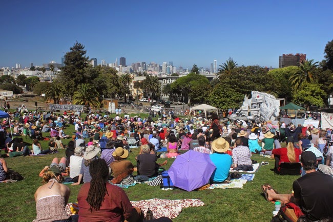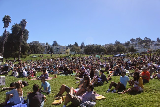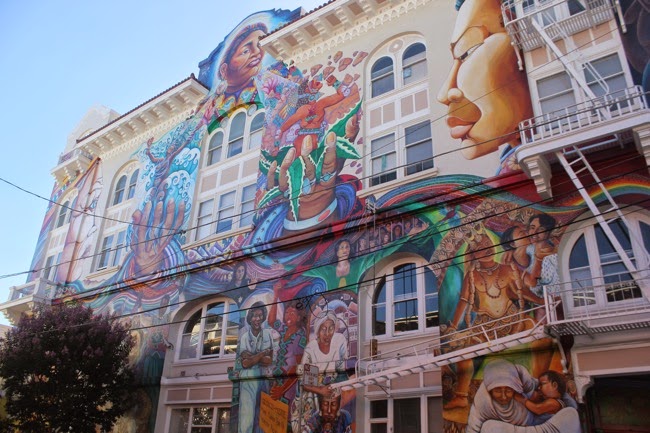 Nadien wandelen we in de buurt van Castro, langs een hele reeks erg mooie huizen en bebloemde straten. We komen algauw terecht in de Mission wijk en het Dolores Park. In het hippe Dolores Park Cafe eten we een gezonde boterham en slaatje, waarna we in het park zelf gaan zitten. Het park zit bomvol jongeren en toeschouwers van een mimevoorstelling. Het is superheet en we zien vele mensen zonnen of picknicken in het gras. Het is leuk om te kijken naar de voorbijgangers.