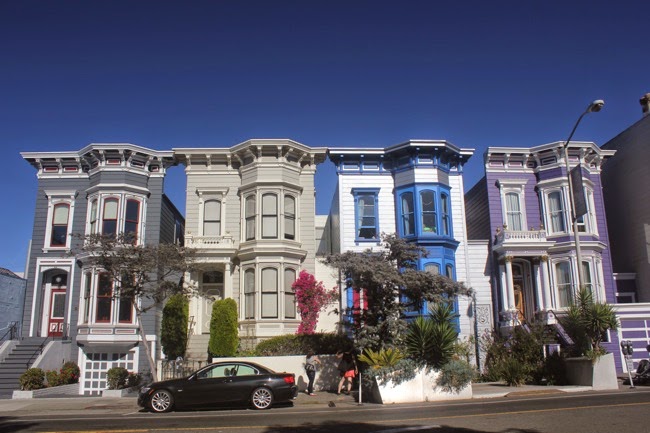 Na een toffe maar warme wandeling op de brug, nemen we de bus richting het zuiden van de stad. We hebben geluk want de buschauffeur van daarnet was te lui om de klok te verzetten en ons ticketje is dus nog de hele voormiddag geldig. We stappen uit in de buurt van Alamo Square en wandelen via aangename straten met mooi versierde, gekleurde huizen tot het parkje. Het park geeft een mooi uitzicht over de stad en een aantal rijhuisjes, bekend als de Painted Ladies, of als de huisjes van de intro van Full House. Het is er vooral gezellig vertoeven. Onze dorst lessen we dankzij een flesje water dat we krijgen van een groep die er een Church Picknick houdt.