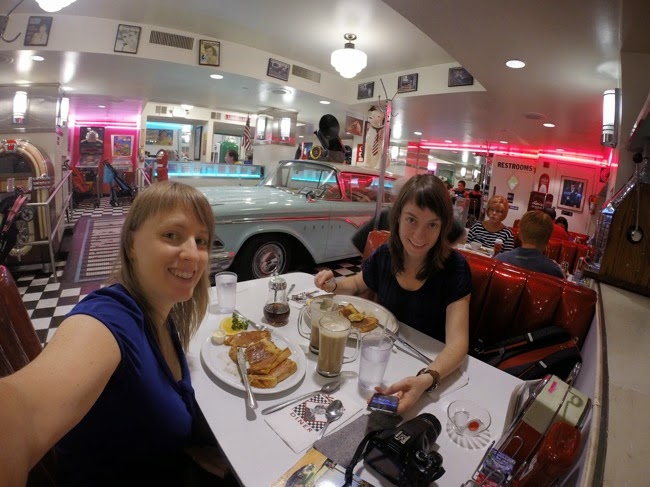 Zoals te verwacht viel, zijn we door het uurverschil vroeg wakker. Ideaal dus om de stad te verkennen. We beginnen de dag met en stevig ontbijt in Lori’s diner, een typische diner geheel in jaren ’50 stijl met een old-timer auto en een standbeeldje van de hond van His Masters Voice. We nemen de French Toast en krijgen een bord met wel zes dikke stukken toast. Zelfs ik krijg mijn bord niet leeg!