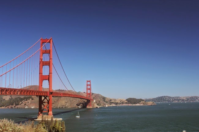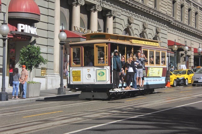 Nadat onze magen goed gevuld zijn, gaan we richting Union Square. Er staat al een ellenlange rij voor een ritje op de authentieke tram. Wij passen liever voor de wachtrij en gaan in het visitor center tips vragen voor het busvervoer. Een supersympathieke dame overstelpt ons met goede raad, die we braaf opvolgen. Een vlotte busrit brengt ons naar de Golden Gate Bridge. We hebben geluk want de brug is helemaal zichtbaar, geen wolkje of mist te bespeuren! Ideaal om een stukje over te brug te wandelen!