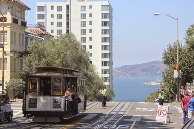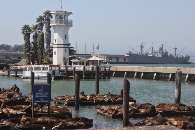 Het is al erg warm wanneer we met de boot terug aan wal komen. We wandelen langs de kaaien en eten een typische crab chowder (soep geserveerd in een broodkom) aan Pier 39. Daarna gaan we kijken naar de zeeleeuwen die aan het zonnen zijn op de pontons. Het is grappig om te zien hoe ze elkaar van de pontons duwen om een plekje te vinden.