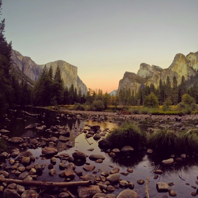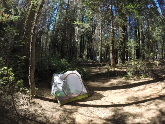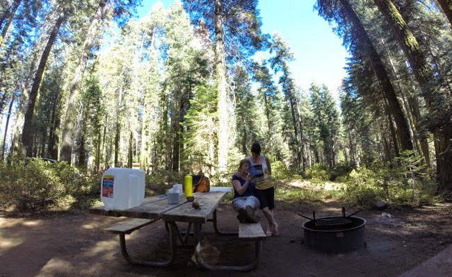 Onderweg richting Yosemite NP stoppen we aan een Target supermarkt om een frigobox, ijs en eten te kopen. Via een kronkelende baan rijden we verder door tot de ingang van Yosemite NP. De annual pass van onze (schoon)moeder kunnen we zonder probleem hergebruiken dankzij het feit dat zij slechts één handtekening ingevuld hadden en wij dus een eigen handtekening kunnen toevoegen.We rijden door tot aan de Crane Flat campground, niet zo erg ver van de ingang gelegen, en zetten onze tent op aan een mooi plekje onder de hoge sequoia-bomen. Het bovenzeil gebruiken we niet, het is hier warm genoeg om enkel met het muggennet te slapen.