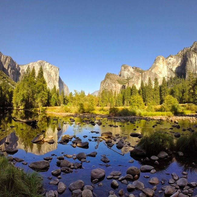 Ondertussen is het al namiddag en we hebben zin om een frisse duik te nemen. We rijden terug tot Yosemite Valley, kopen er nog wat spullen in de winkel en laten de auto dan achter aan de picknick area bij El Capitan. Het is even stappen door de brousse, maar dan vinden we een klein strandje aan de Merced River, waar we ons omkleden om in het water te gaan. Onze camping heeft geen douche, dus we zijn blij dat we ons hier even kunnen afspoelen, al is dat dan wel zonder zeep of shampoo. Het frisse water doet deugd en we nemen de tijd om te drogen in het zonnetje, gewapend met een boek en een verrekijker om klimmers op El Capitan te stoppen (zonder resultaat).