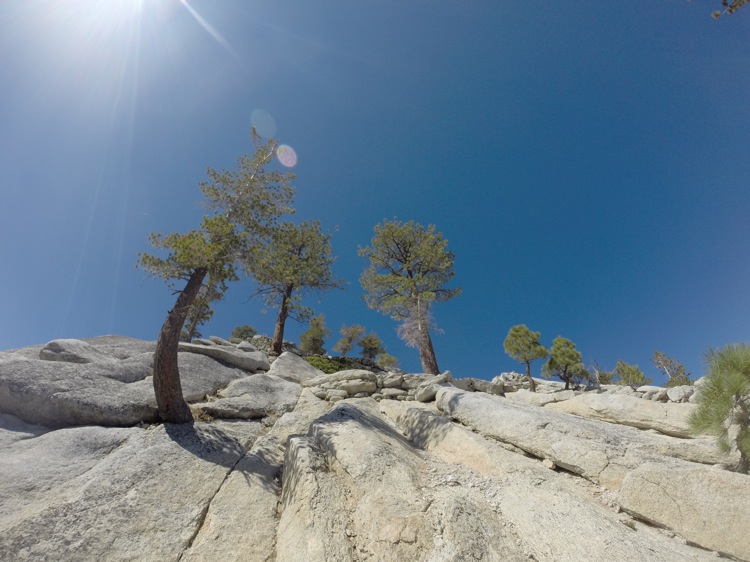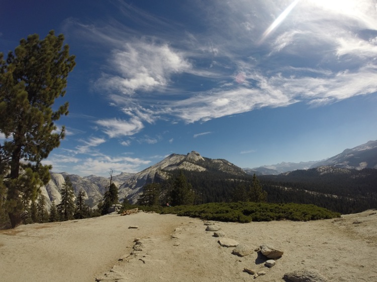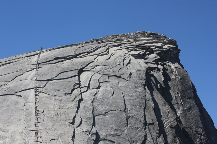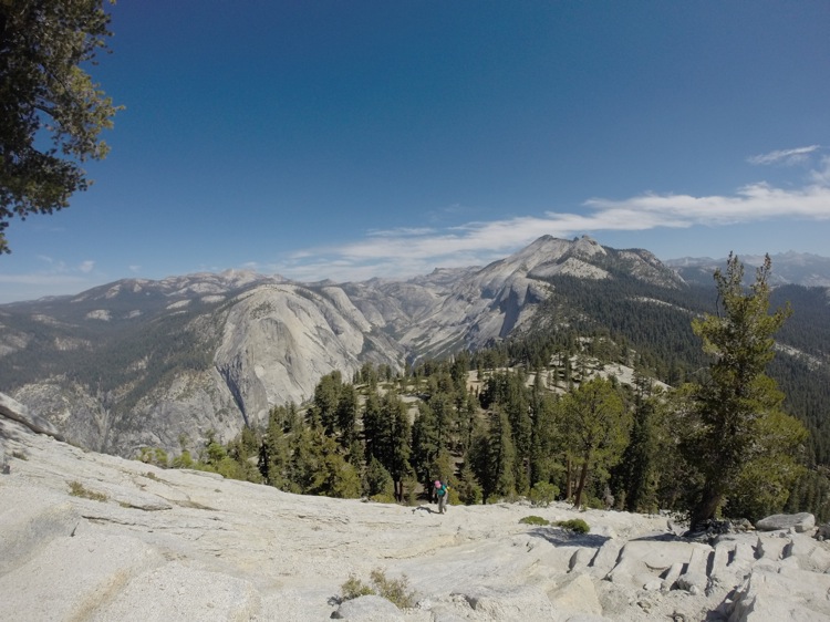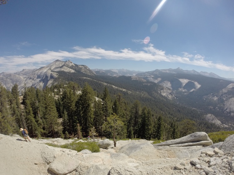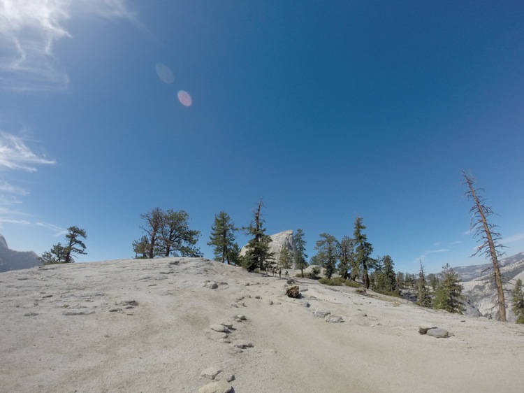 Vanaf de controleplaats is het terug klimmen geblazen, al zigzaggend door een bos met oude sequoiabomen. Na een tijdje komen we toe aan een splitsing en een wegwijzer dat 2 mijl aangeeft tot de Half Dome. We zijn opgetogen dat we bijna aan de top zijn. Helaas lijken die 2 mijl wel eindeloos te duren. De zon staat ondertussen al hoog en we ontkomen niet meer aan de hitte. Plots komen we uit op een open plateau en krijgen we voor het eerst een glimps te zien van de kabels op de Half Dome. Maar daar nog voor zien we ook een loodrecht stuk dat er verradelijk steil uitziet: de Subdome. Dit hadden we niet verwacht!
