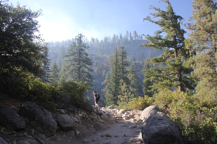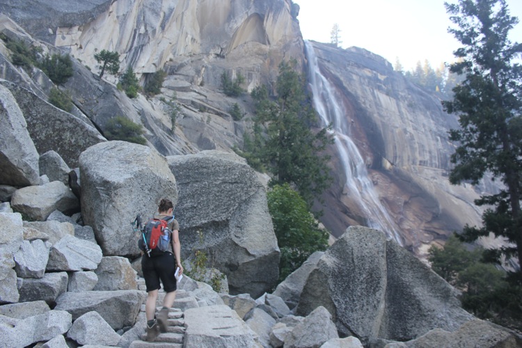 De start van de wandeling gaat vlot. Het is half zeven en er is ondertussen al voldoende licht van de opkomende zon, zodat we onze zaklampen niet nodig hebben. Het pad is geasfalteerd en stijgt heel rustig aan, ideaal om op te warmen. Ondanks het vroege uur hebben we al snel te warm en doen we onze fleece uit. Na een gestage klim komen we toe aan de voet van de Vernal Fall. Op het einde van de zomer stelt de waterval niets meer voor dan een smal stroompje dat naar beneden spettert. Maar hier is een waterfonteintje dat dienst doet als laatste vulstation, want na dit punt is er geen drinkbaar water meer te vinden (tenzij je een filter gebruikt natuurlijk). We nemen een grote slok van het water en trekken verder. We zijn alleszins goed voorzien op hitte en inspanning: onze rugzakken zijn gevuld met 3 liter water elk en hopen nootjes, energierepen, fruit,…