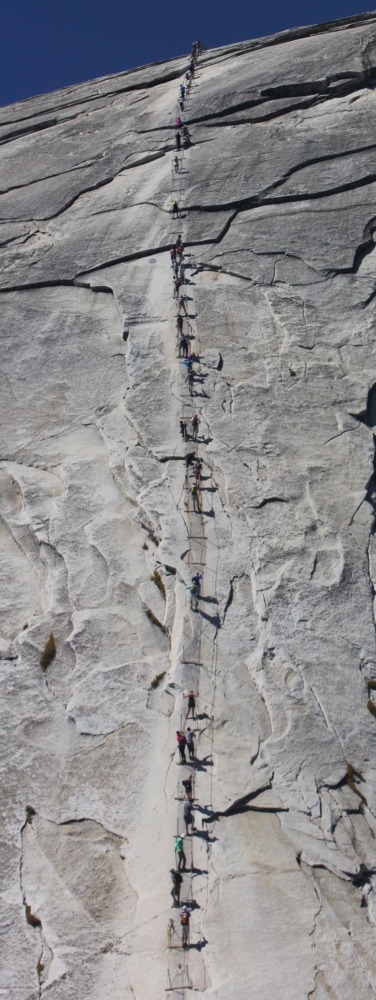 We blijven nog een poosje toekijken naar de sterkste en moedigste klimmers die tot boven geraken en genieten van het uitzicht dat over heel Yosemite NP reikt. Ondertussen doen een troep eekhoorntjes zich te goed aan het eten in de achtergelaten rugzakken. Het is snikheet en we smeren nog eens uitgebreid zonnecreme.