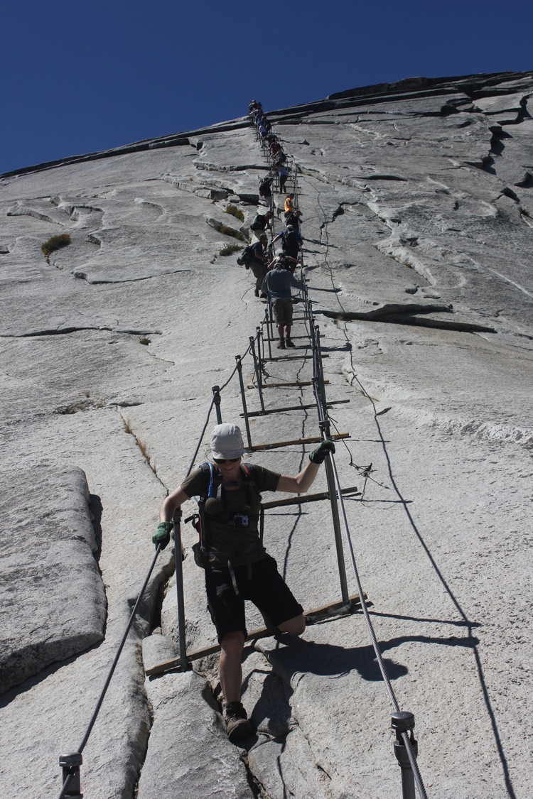 Plots houden de trapjes op en moeten we met handen en voeten klauteren over het graniet. Gelukkig bieden onze schoenen veel grip! En dan staan we er eindelijk, aan de voet van de kabels die naar de top leiden. Loodrecht naar boven gaan ze, met aan beide kanten een erg steile afgrond en vooral: niet meer dan twee kabels en af en toe een houten blokje om je aan op te trekken en in leven te houden. No way dat ik daarop ga: ik ben moe en bedenk dat we ook nog helemaal terug naar beneden moeten. Ulrike durft gelukkig meer en waagt zich aan een poging tot de top. Ik blijf aan de voet van de kabels om samen met een aantal andere toeschouwers te kijken hoe de moedigsten het ervan af brengen.