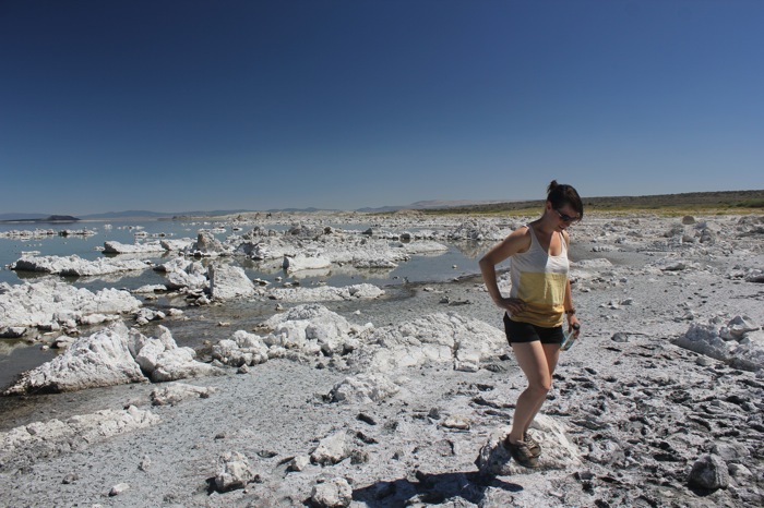 We stoppen even aan een uitzichtspunt voorbij Lee Vining en wandelen tot aan het meer om de tufa’s van dichtbij te bewonderen. Ulrike zakt meteen door de drassige bodem en haar schoen zit helemaal in het slijk. We moeten hier oppassen waar we onze voeten zetten! Omdat het hier heel erg warm is, houden we de wandeling kort.
