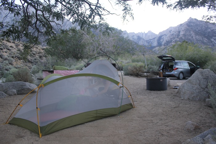 We rijden voorbij de stad Bishop en komen na een aantal uren rijden toe in Lone Pine, onze eindbestemming van vandaag. Het is al zes uur ’s avonds, dus willen we meteen een leuke kampeerplek vinden voor het donker wordt. We nemen een kijkje op de Portagee Joe Campground, maar zijn niet overtuigd van de plekjes met weinig privacy en de ligging langs de baan onder elektriciteitspalen. We rijden dan maar verder via de Whitney Portal Road, in de hoop dat er leukere campings te vinden zijn. De weg doorheen de Alabama Hills is alvast prachtig.