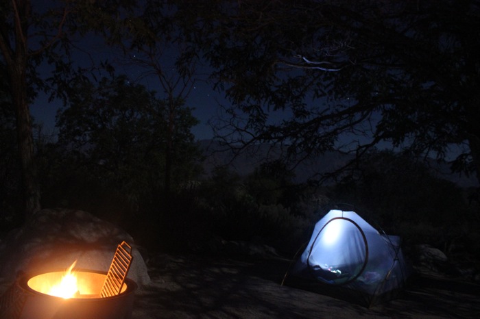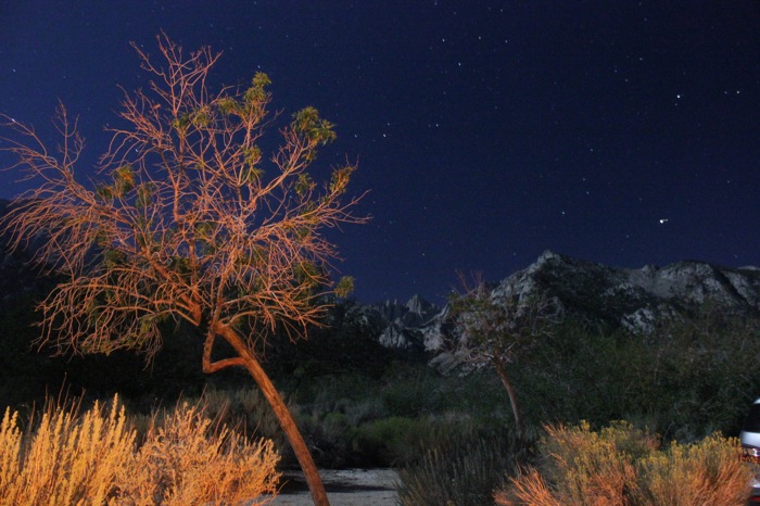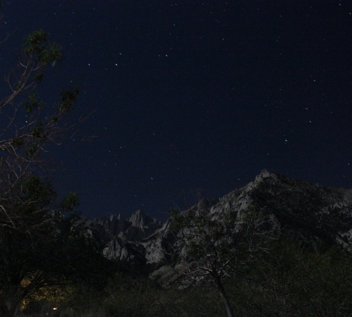 Na het eten wandelen we even door het centrum. In een hostel vragen we of er douchemogelijkheden zijn en krijgen we meteen toegang tot een grote badkamer met twee douches. Betalend weliswaar, maar dat hebben we er wel voor over. Na een goede warme douche doen we enkele inkopen in de lokale supermarkt en keren we terug naar de camping. We brengen de avond door aan het kampvuur en genieten van de heldere sterrenhemel en de volle maan die de pieken van Mount Whitney verlicht. Wanneer we in bed kruipen zien we de sterren nog steeds boven ons.