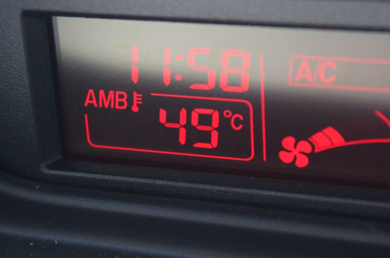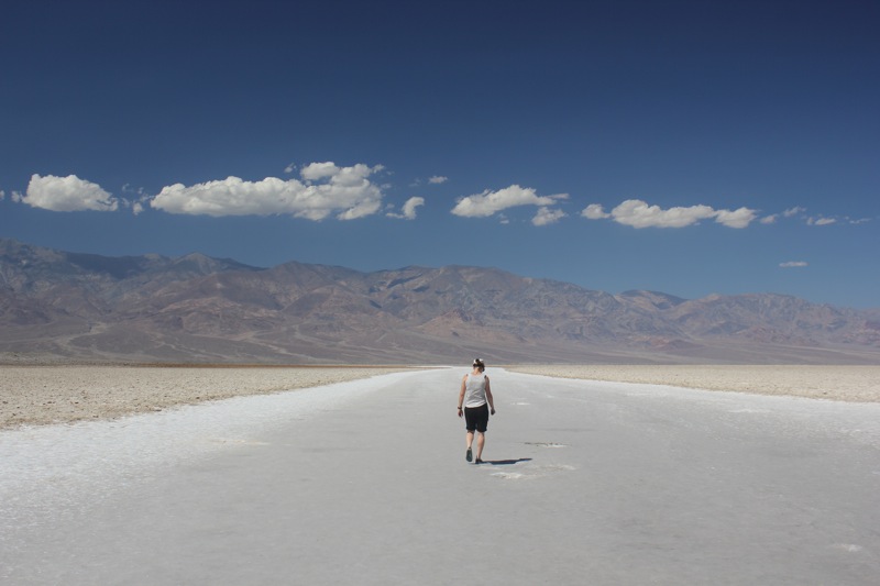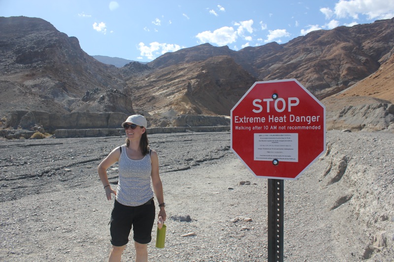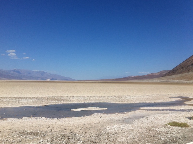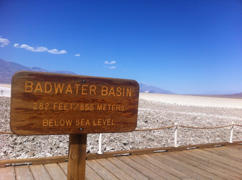 Aan Furnace Creek bezoeken we even het heerlijk frisse museum in het Visitor Center. We kopen iets fris om te drinken in het nabijgelegen winkeltje en trekken dan weer verder door de dorre, hete woestijn. In Badwater Basin zijn we toegekomen op het laagste punt van Death Valley, 855 meter onder de zeespiegel. Het is er ook de warmste plek van het park: de thermometer van de auto geeft 49° Celcius aan! Wanneer we hier uitstappen lijkt het wel of we in een heteluchtoven zijn terechtgekomen. Er blaast een hete wind in ons gezicht en de hitte pakt meteen op onze adem. Het is een ervaring op zich, maar eentje die we niet lang uithouden. Gelukkig is het lekker koel in de auto…