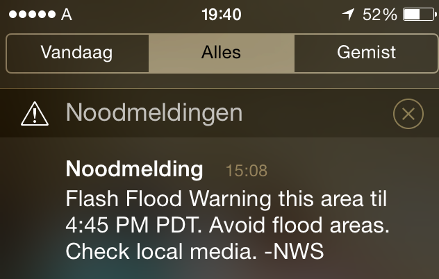 Na een uurtje rijden keert het weer om en zakt de temperatuur gevoelig. Er steekt een felle wind op en de lucht is bezaaid met wolken. Wanneer we door Red Rock Canyon rijden maakt mijn gsm plots een oorverdovende bieptoon. Er komt een noodmelding op het scherm dat ons waarschuwt voor ‘flash floods’, ofte modderstromen. We weten niet goed wat we hiermee moeten aanvangen, maar aangezien alle andere auto’s gewoon doorrijden, doen we dat dan maar ook. De lucht ziet er wel onheilspellend uit, maar momenteel regent het nog niet dus lijkt er ons geen gevaar te zijn waar we ons bevinden.