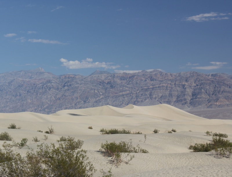 De volgende stop is aan Mesquite Dunes, een aantal mooie zanderige duinen midden in de vallei. Met sandalen stappen we door het hete zand. Ook hier blijven we niet lang buiten, het is gewoonweg té warm.