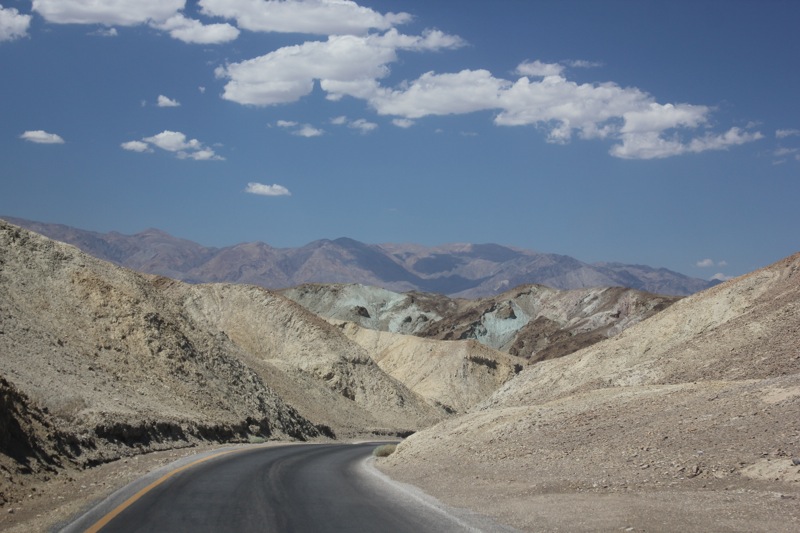 Op de terugkeer doen we een ommetje via de Artist Drive, een supermooie en kronkelende weg door heuvels die allerlei vreemde kleuren aannemen. De baan gaat continu op en neer en zorgt voor spectaculaire uitzichten. Onderweg stoppen we even voor een experimentje: aanvankelijk wilden we een ei bakken op het hete asfalt maar bij gebrek aan een ei, maken we er een raclette van. We leggen twee plakjes kaas in een pannetje en leggen het op een steen. De kaas begint al snel te zweten, maar helaas krijgen wij het zelf zodanig warm dat we het niet langer uithouden en we terug in de auto stappen. We leggen dan maar de pan op het dashboard en, ongelofelijk maar waar, ondanks de airco begint de kaas meteen te smelten! Samen met wat Tostitos maken we er een smakelijk hapje van. Experiment geslaagd!