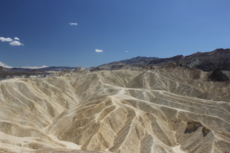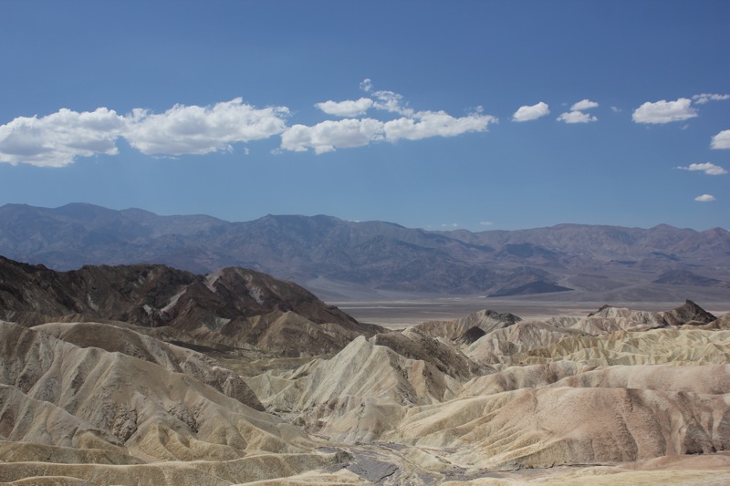 Wanneer we terug op de hoofdweg zijn, rijden we verder tot aan Zabriskie Point, onze laatste stop in Death Valley. Het uitzicht is hier weer helemaal anders dan in de rest van het park en is werkelijk adembenemend. We wandelen even van de grote parking tot het uitzichtspunt, al kost ons dat veel gepuf (we zijn zo’n hitte echt niet gewoon, wij Belgen).