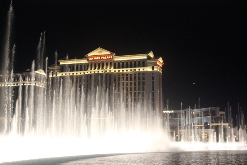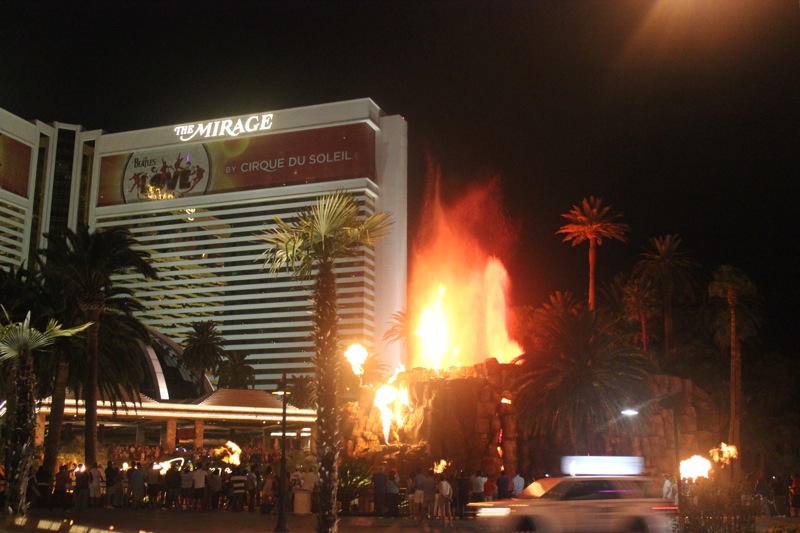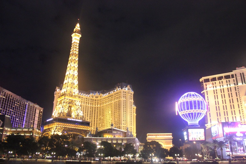 Op straat worden we verrast door de ontploffing van een vulkaan met veel vlammen en vuurwerk, en een beetje verder bewonderen we een replica van de Eiffeltoren en kijken we naar een fonteinenshow voor The Bellagio.