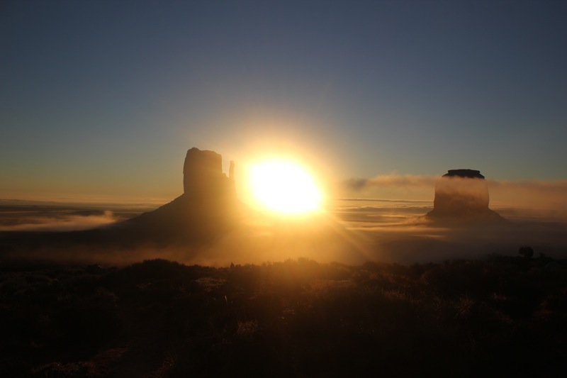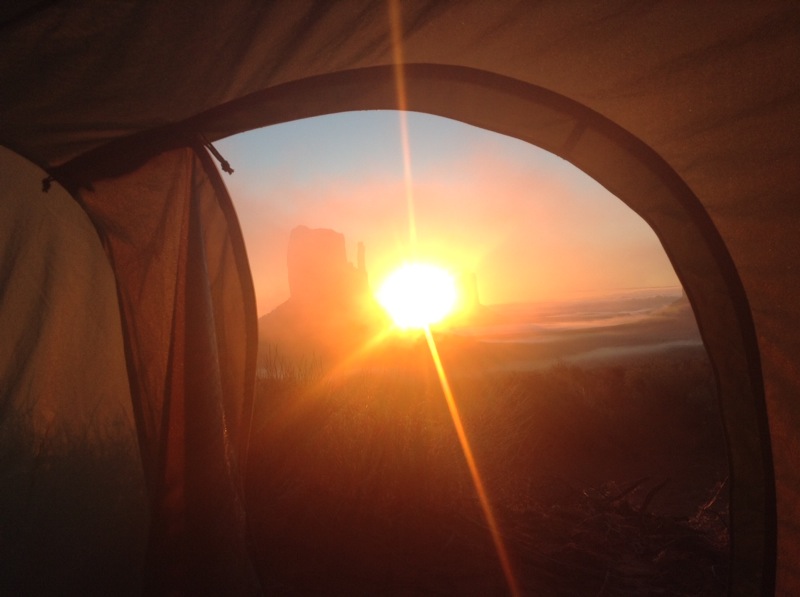 Deze ochtend worden we niet gewekt door een wekker, maar door de opkomende zon die op het tentzeil schijnt. Wanneer we onze tent openritsen worden we meteen verrast door een adembenemend uitzicht: de rotsen van Monument Valley zijn gehuld in een laaghangende mist en de ochtendzon zorgt voor prachtige kleuren. Dit is veruit de mooiste zonsopgang die we ooit gezien hebben.