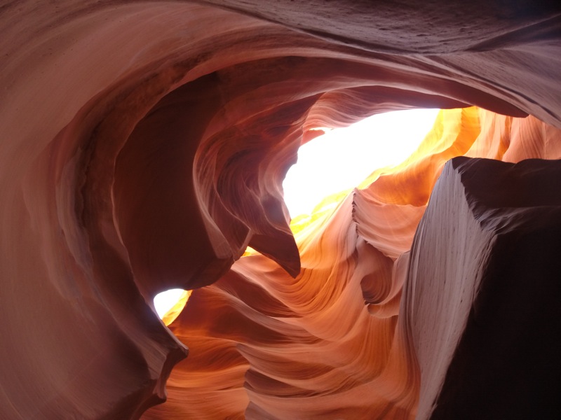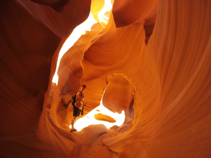 Vanuit John Ford’s Point rijden we terug naar de camping en plooien we de tent op. We laten Monument Valley achter ons en rijden via Kayenta door niemandsland in de richting van Page. Net voor we Page binnenrijden nemen we een zijweg naar de Lower Antelope Canyon. Aan de overkant van de hoofdbaan ligt de meer populaire Upper Canyon, maar we verkiezen de Lower Canyon omdat we lazen dat deze avontuurlijker is en minder volk lokt. Maar dat laatste blijkt precies niet te kloppen: er staan meer dan vijftig mensen in de hitte aan te schuiven voor een bezoek aan de canyon. We gaan in de rij staan en krijgen een ticketje voor het bezoek van 11h45. Er zijn twee prijzen, één voor de gewone tour en een duurdere prijs voor de fotografietour waarbij je tussen twee begeleide groepen in de canyon mag en foto’s kan nemen met statief. Wij kiezen uiteraard voor de gewone tour, die vinden we op zich al duur genoeg (iets van 30 euro per persoon). Een aziatisch koppel met enorme fototoestellen en statieven kiest na lang treuzelen voor de fotografietour en mag na enkele minuten al vertrekken naar de canyon.