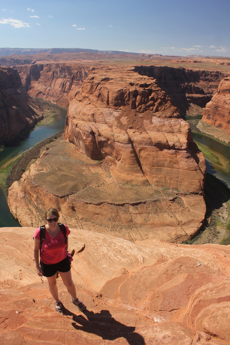 Wanneer we toekomen aan Horseshoes Bend is het snikheet. Een ranger staat aan het begin van het pad naar het uitzichtspunt om ons te waarschuwen voor de hitte en uitdrogingsgevaar. Hij controleert of we wel voldoende water bij ons hebben. Het is niet zo’n lang stuk wandelen tot het uitzichtspunt, maar het is zodanig warm dat het toch zwaar valt. De korte wandeling loont wel de moeite, want plots sta je oog in oog met een gigantische meander. De Tombeau du Géant is er niets bij.