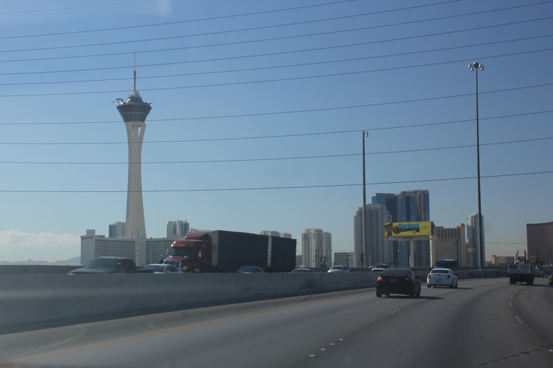 In La Verkin stoppen we even om de auto vol te tanken en een grote zak ijs te kopen voor de frigobox. Ondanks het vroege uur is het al erg warm, dus kunnen we maar best onze drankjes koel houden. We rijden zonder stoppen door tot voorbij Las Vegas. Ondanks het feit dat we Las Vegas al eerder tijdens deze vakantie hebben bezocht, blijft de doorrit indrukwekkend.