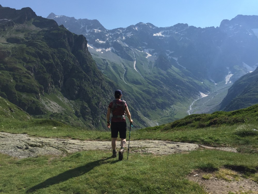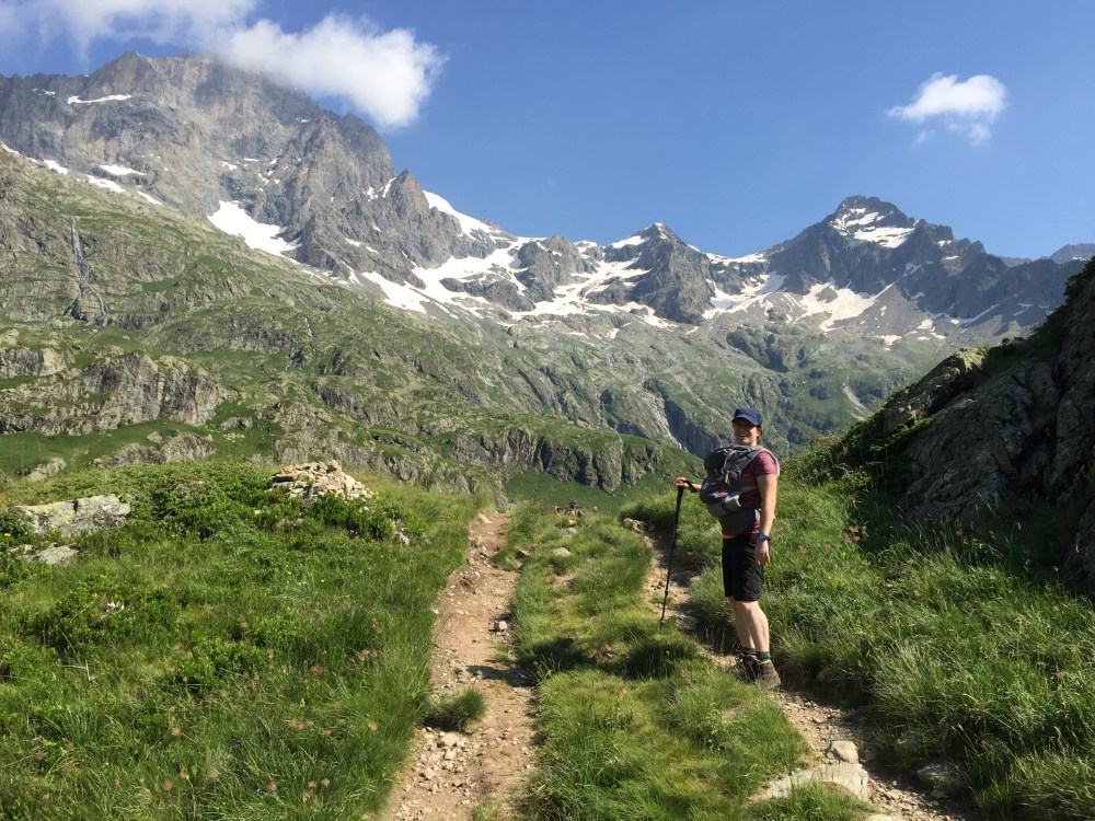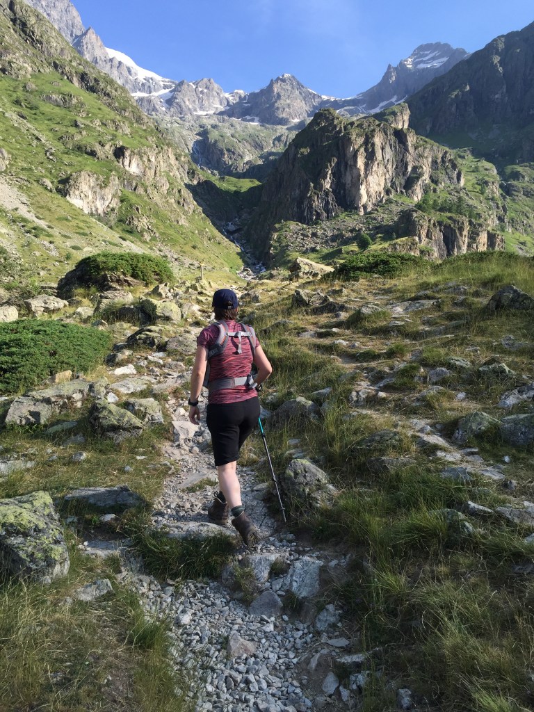 We keren via een ander pad via de Lac Bleu terug naar de Chalet de Gioberney en dalen in hoog tempo terug af in de vallei. Er is hier nergens schaduw en het is even zoeken naar een struikje waaronder ik kan zitten om Alice in de schaduw te voeden. Na deze laatste pitstop stappen we door tot aan de parking. Tijd om verkoeling te zoeken in de auto na deze uiterst geslaagde wandeling!