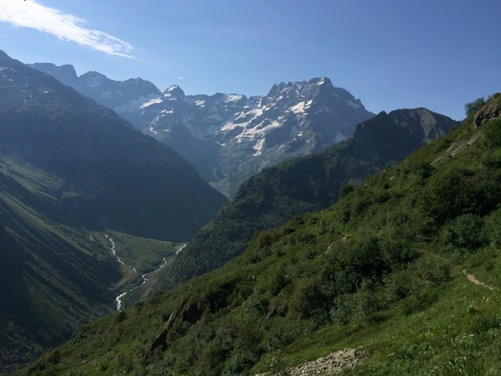 Vanop het pad hebben we een prachtig uitzicht op de vallei en de achtergelegen bergen.