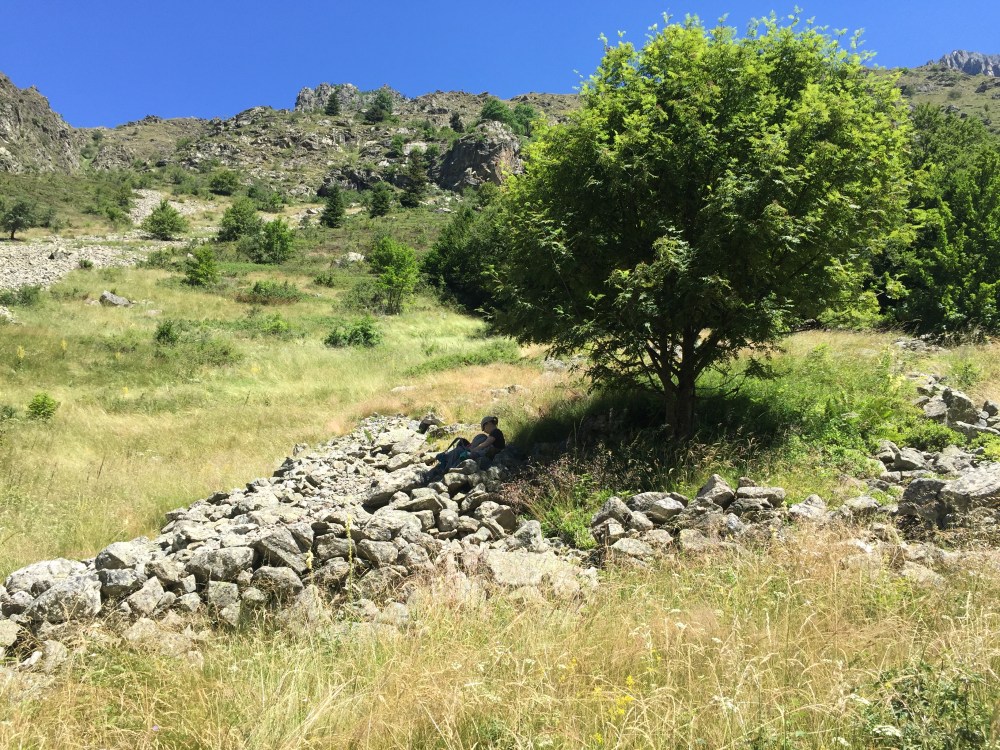 Na een uurtje wandelen houden we halt onder de schaduw van een boom, zodat Alice even kan drinken en wij iets kunnen eten. Ulrike gaat nog even op verkenning tot de Sources des Doux, enkele meters verderop en dan maken we rechtsomkeer.