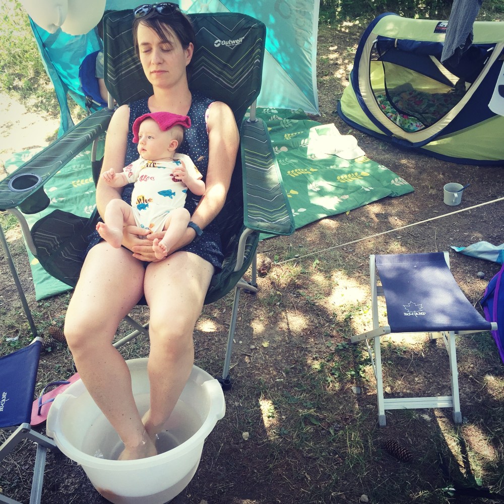 Op die twee weken tijd hebben we alle weersomstandigheden mogen meemaken. De eerste dagen zaten we midden in een hittegolf. Alice lieten we de hele tijd in haar pamper in de schaduw van de tarp en wandelingen beperkten we tot de vroege voormiddag als het nog niet te warm was. Tijdens de warmste uren zochten we verkoeling met een fris washandje en een lauw (voeten-)badje in de tummy tub bademmer. Maar na enkele dagen sloeg het weer om en ontwaakten we bij 3 graden Celsius en moesten we Alice warm houden met een dikke slaapzak en muts. Om dan weer enkele dagen later temperaturen tegen de 30 graden te hebben!